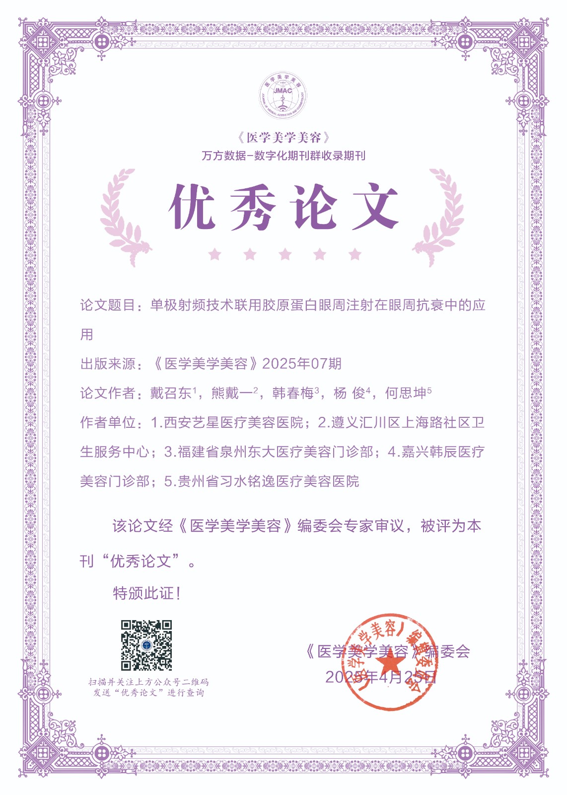 为了进一步激发作者的学术热情,提升理论研究水平,展现医学美容领域先进技术及研究成果,新的一年,我刊大幅度更新了证书样式,并在公众号平台提供证书查询功能,获奖者在公众号对话界面输入论文通讯作者或者第一作者即可查询到获奖证书。另外入选论文信息将在《医学美学美容》纸质期刊、官方网站等渠道同步展示,如需纸质版证书,可联系我部邮寄。经编辑部初评,专家评审,上级批准后,下列论文荣获《医学美学美容》2025年度优秀论文。