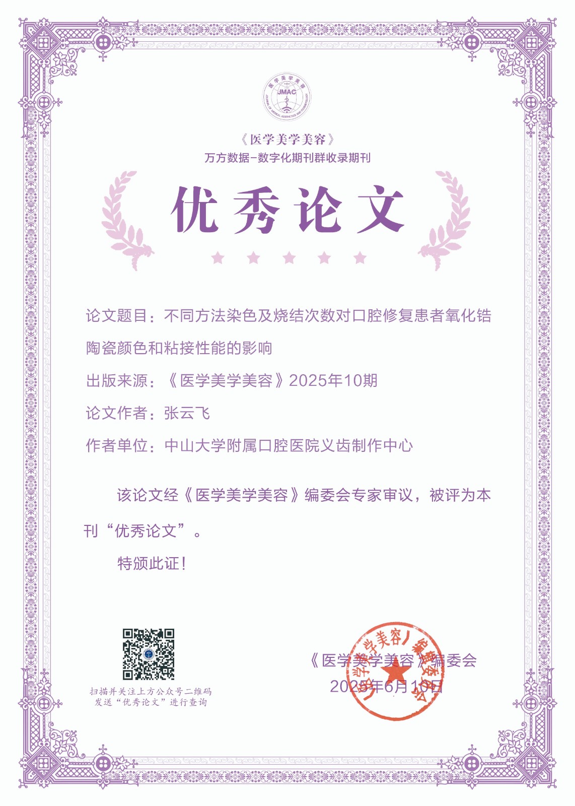 获奖论文01《不同方法染色及烧结次数对口腔修复患者氧化锆陶瓷 颜色和粘接性能的影响》