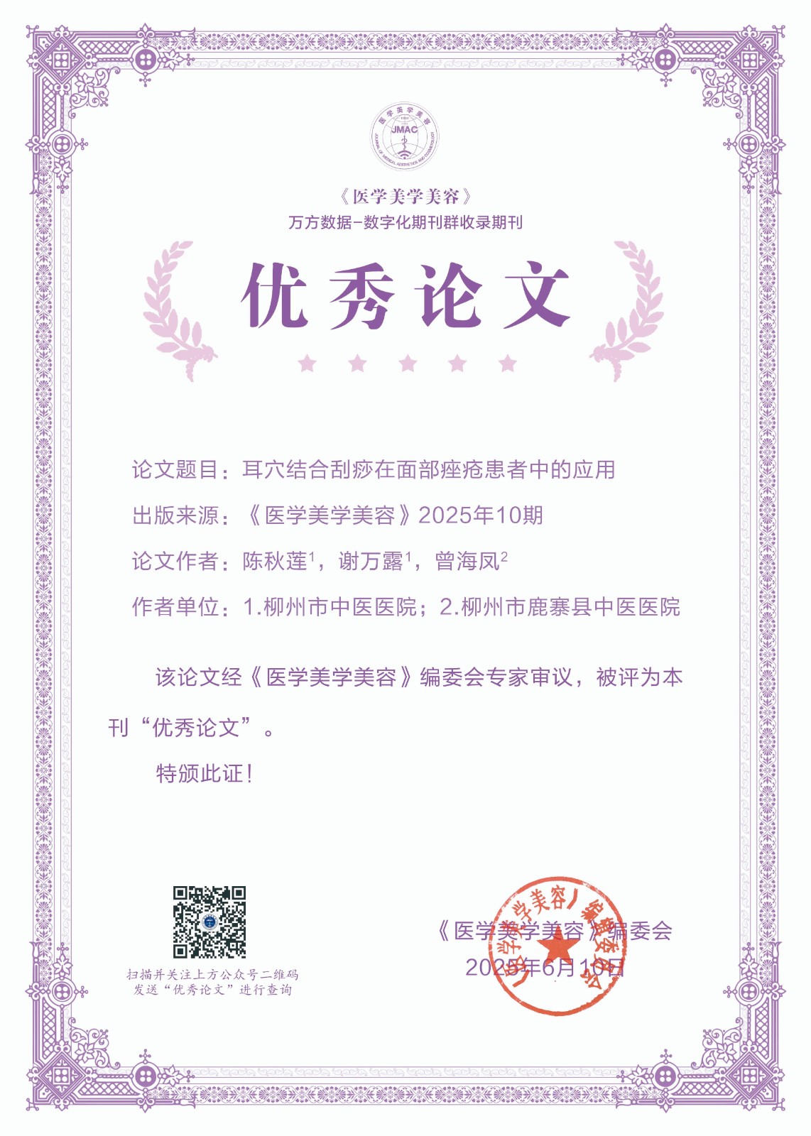 为了进一步激发作者的学术热情,提升理论研究水平,展现医学美容领域先进技术及研究成果,新的一年,我刊大幅度更新了证书样式,并在公众号平台提供证书查询功能,获奖者在公众号对话界面输入论文通讯作者或者第一作者即可查询到获奖证书。另外入选论文信息将在《医学美学美容》纸质期刊、官方网站等渠道同步展示,如需纸质版证书,可联系我部邮寄。经编辑部初评,专家评审,上级批准后,下列论文荣获《医学美学美容》2025年度优秀论文。