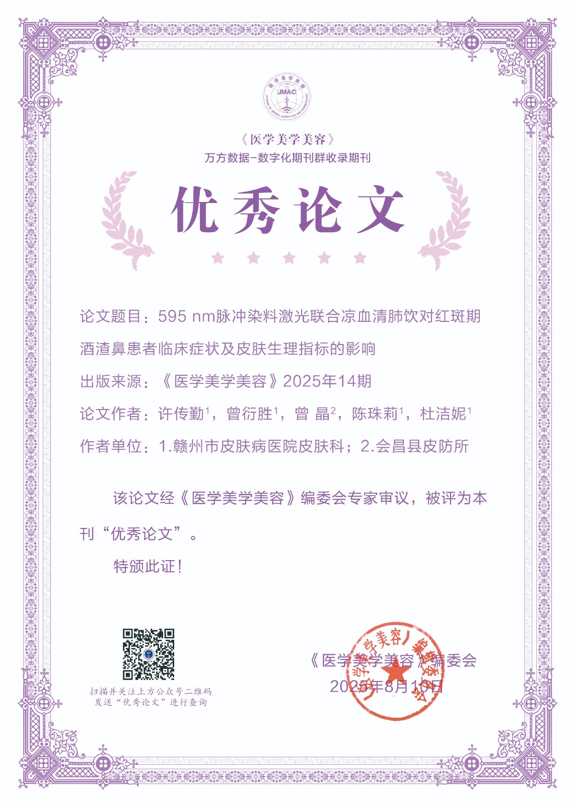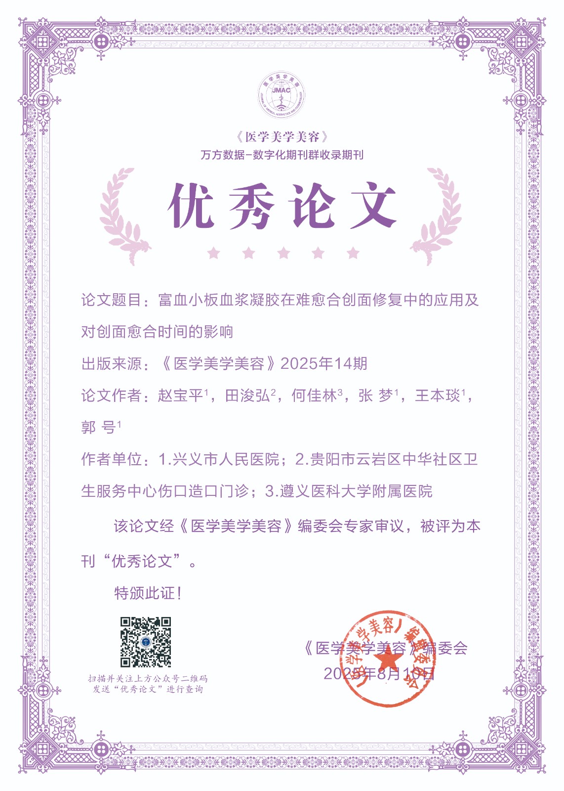 为了进一步激发作者的学术热情,提升理论研究水平,展现医学美容领域先进技术及研究成果,新的一年,我刊大幅度更新了证书样式,并在公众号平台提供证书查询功能,获奖者在公众号对话界面输入论文通讯作者或者第一作者即可查询到获奖证书。另外入选论文信息将在《医学美学美容》纸质期刊、官方网站等渠道同步展示,如需纸质版证书,可联系我部邮寄。经编辑部初评,专家评审,上级批准后,下列论文荣获《医学美学美容》2025年度优秀论文。
