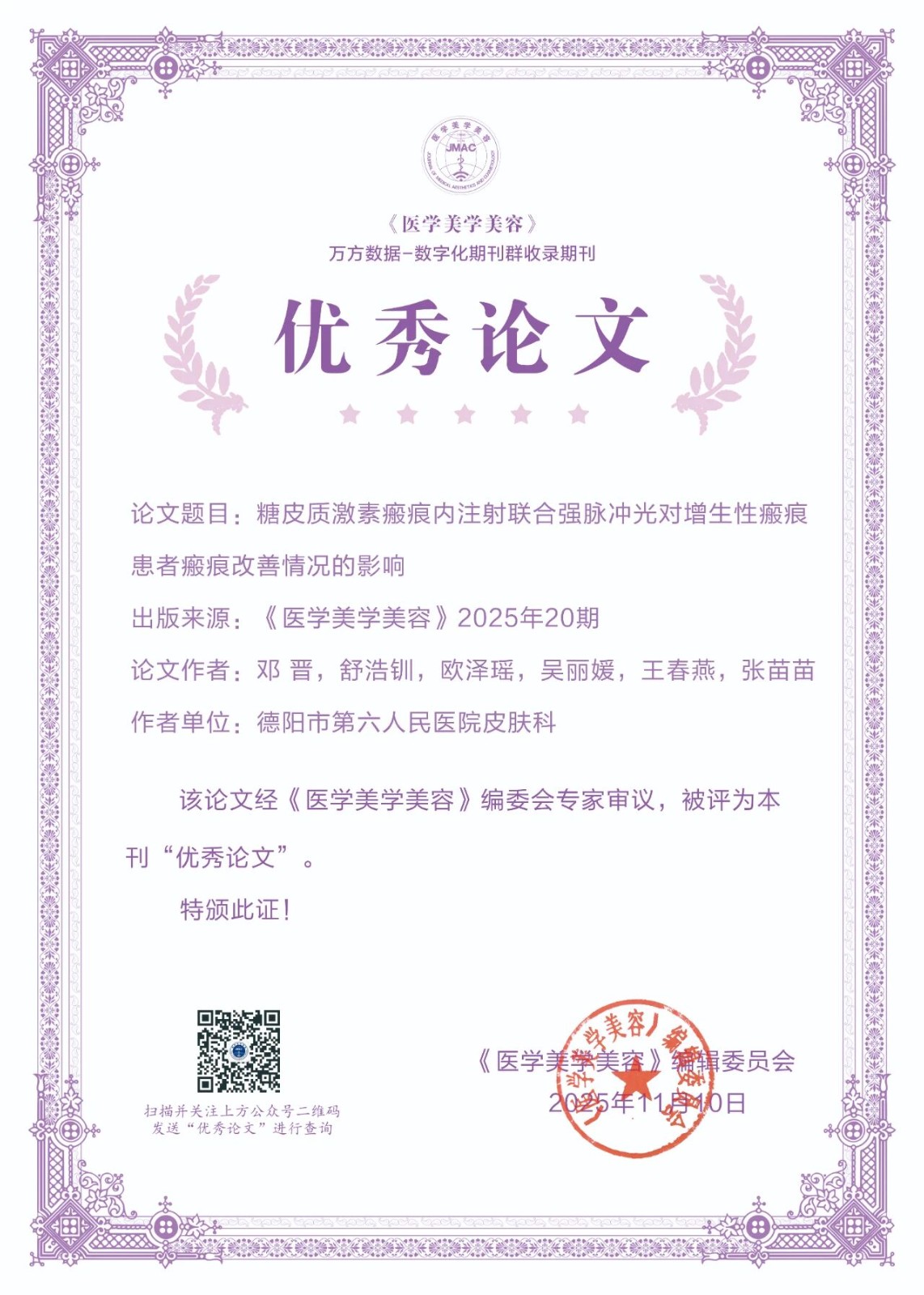 为了进一步激发作者的学术热情,提升理论研究水平,展现医学美容领域先进技术及研究成果,新的一年,我刊大幅度更新了证书样式,并在公众号平台提供证书查询功能,获奖者在公众号对话界面输入论文通讯作者或者第一作者即可查询到获奖证书。另外入选论文信息将在《医学美学美容》纸质期刊、官方网站等渠道同步展示,如需纸质版证书,可联系我部邮寄。经编辑部初评,专家评审,上级批准后,下列论文荣获《医学美学美容》2025年度优秀论文。