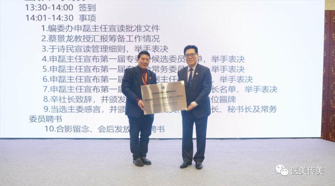社长辛映继致辞并颁发主任委员聘书、主委单位牌匾。主委蔡景龙教授发表感言,表示将以身作则,认真执行管理细则,带领大家一起深入开展瘢痕修复与美学修饰工作,完成编委办安排的工作任务。会上并颁发副主任委员聘书、常务委员聘书。最后,大会人员合影留念。