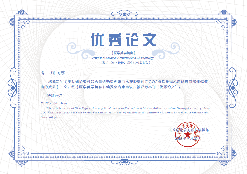 《皮肤修护敷料联合重组贻贝粘蛋白水凝胶敷料在CO2点阵激光术后修复面部痤疮瘢痕的效果》