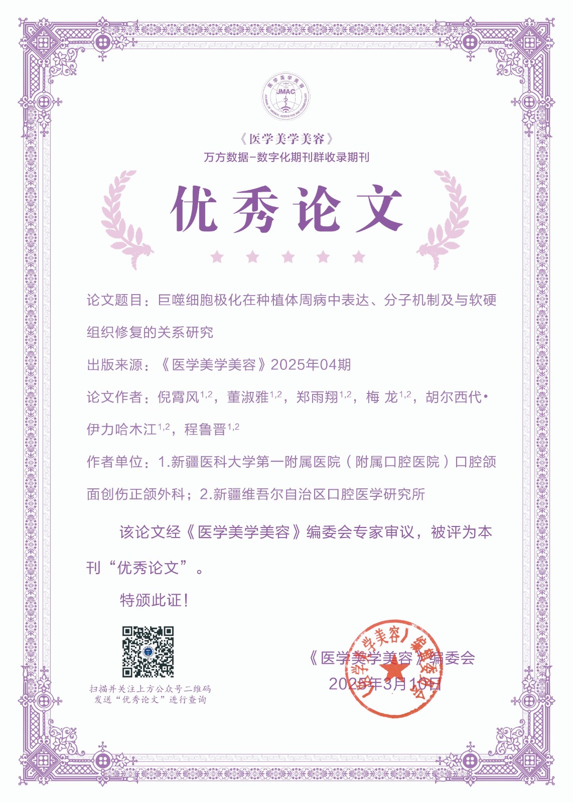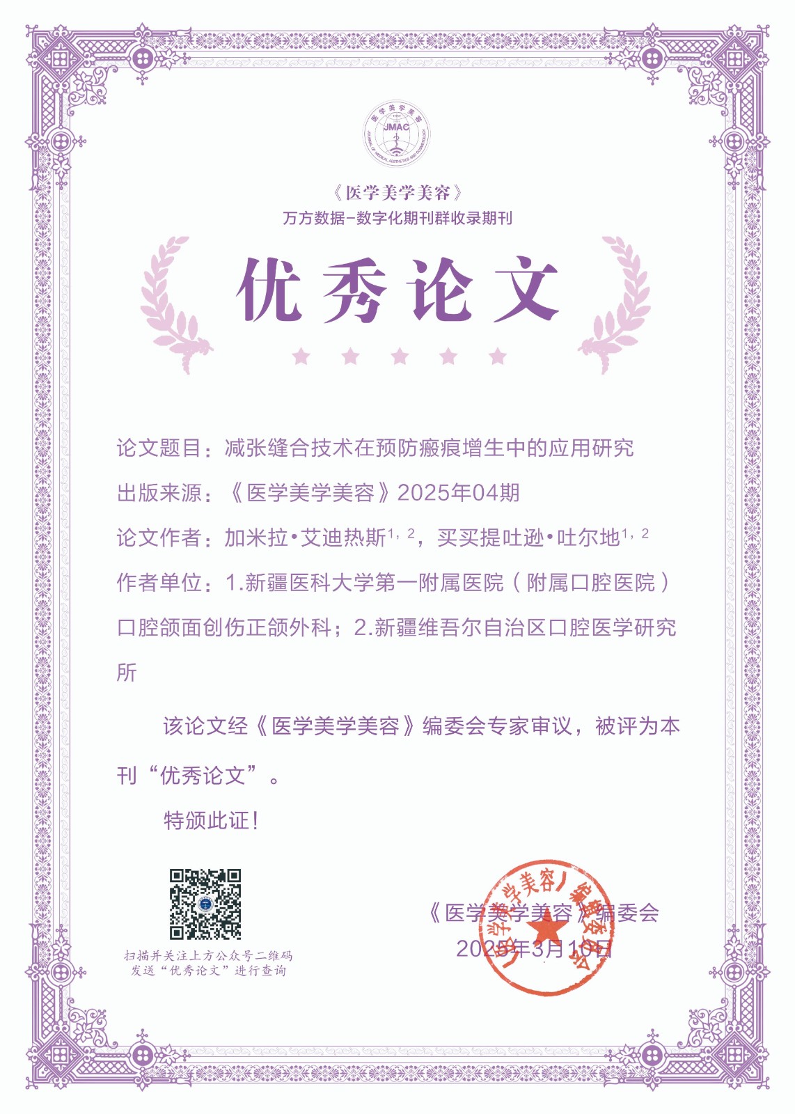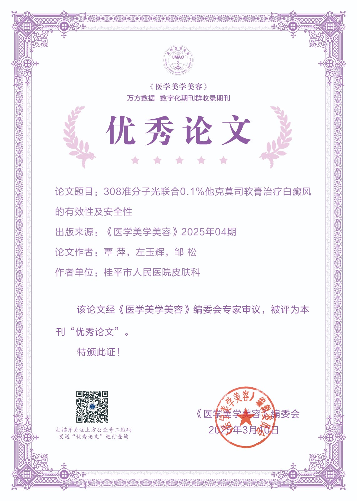 为了进一步激发作者的学术热情,提升理论研究水平,展现医学美容领域先进技术及研究成果,新的一年,我刊大幅度更新了证书样式,并在公众号平台提供证书查询功能,获奖者在公众号对话界面输入论文通讯作者或者第一作者即可查询到获奖证书。另外入选论文信息将在《医学美学美容》纸质期刊、官方网站等渠道同步展示,如需纸质版证书,可联系我部邮寄。经编辑部初评,专家评审,上级批准后,下列论文荣获《医学美学美容》2025年度优秀论文。