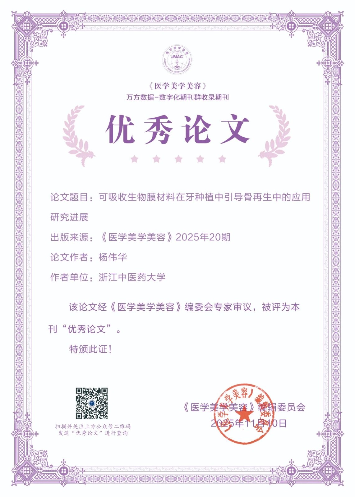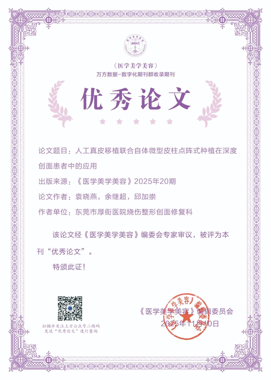 为了进一步激发作者的学术热情,提升理论研究水平,展现医学美容领域先进技术及研究成果,新的一年,我刊大幅度更新了证书样式,并在公众号平台提供证书查询功能,获奖者在公众号对话界面输入论文通讯作者或者第一作者即可查询到获奖证书。另外入选论文信息将在《医学美学美容》纸质期刊、官方网站等渠道同步展示,如需纸质版证书,可联系我部邮寄。经编辑部初评,专家评审,上级批准后,下列论文荣获《医学美学美容》2025年度优秀论文。