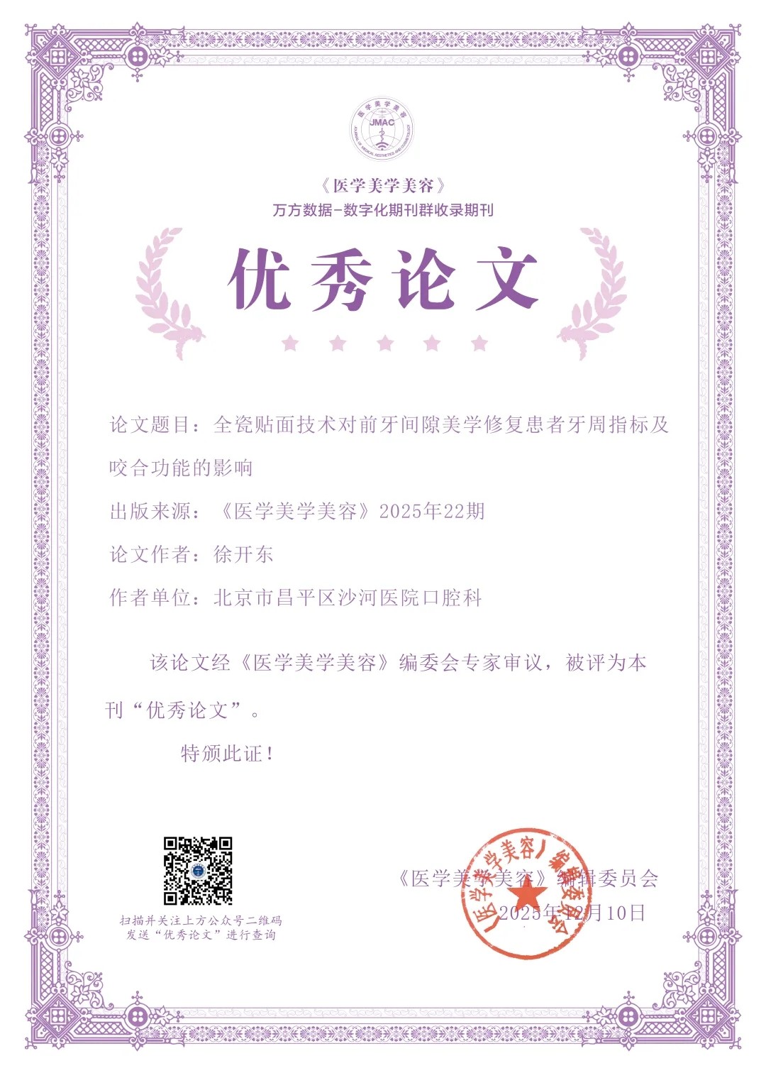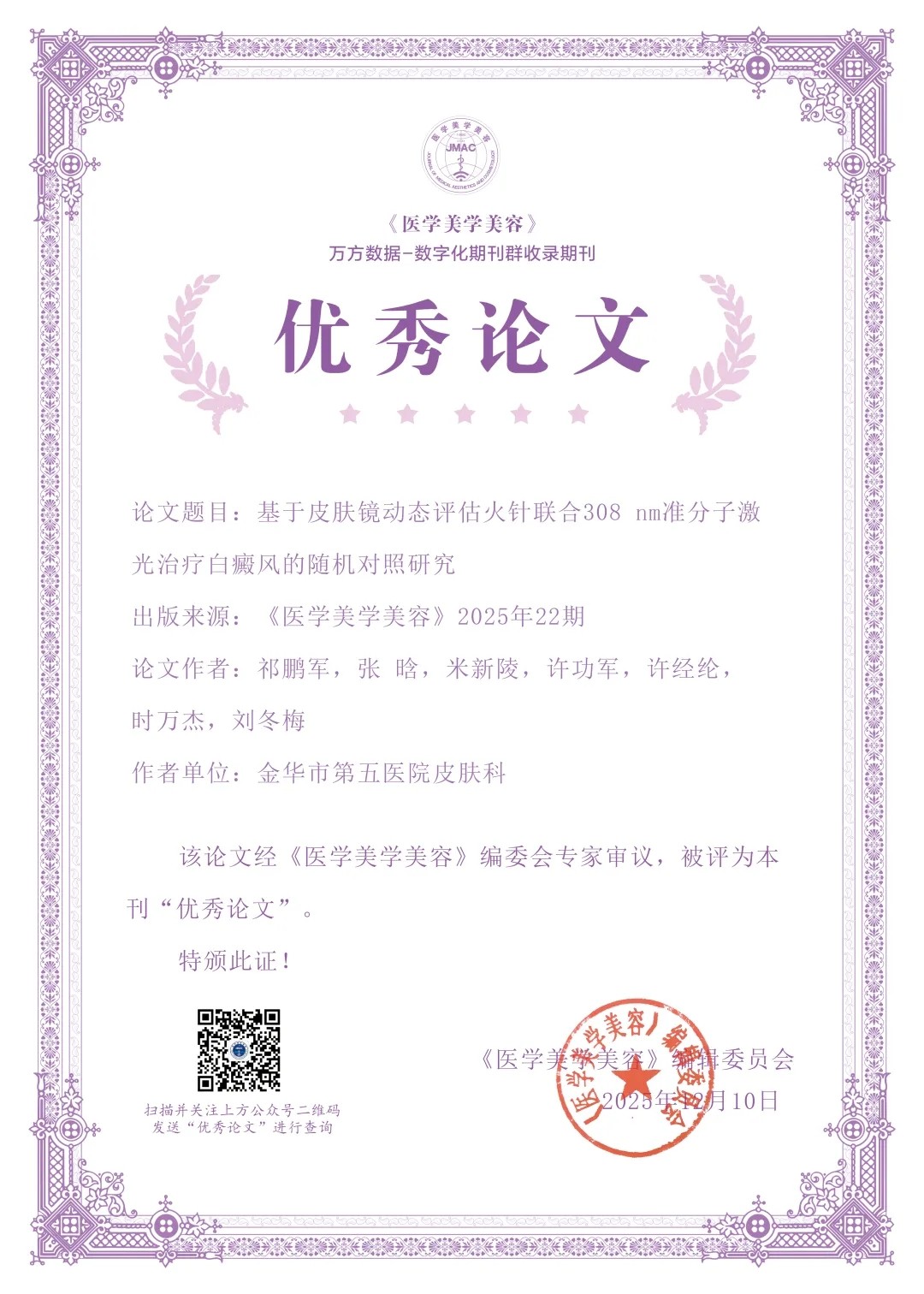 为了进一步激发作者的学术热情,提升理论研究水平,展现医学美容领域先进技术及研究成果,新的一年,我刊大幅度更新了证书样式,并在公众号平台提供证书查询功能,获奖者在公众号对话界面输入论文通讯作者或者第一作者即可查询到获奖证书。另外入选论文信息将在《医学美学美容》纸质期刊、官方网站等渠道同步展示,如需纸质版证书,可联系我部邮寄。经编辑部初评,专家评审,上级批准后,下列论文荣获《医学美学美容》2025年度优秀论文。