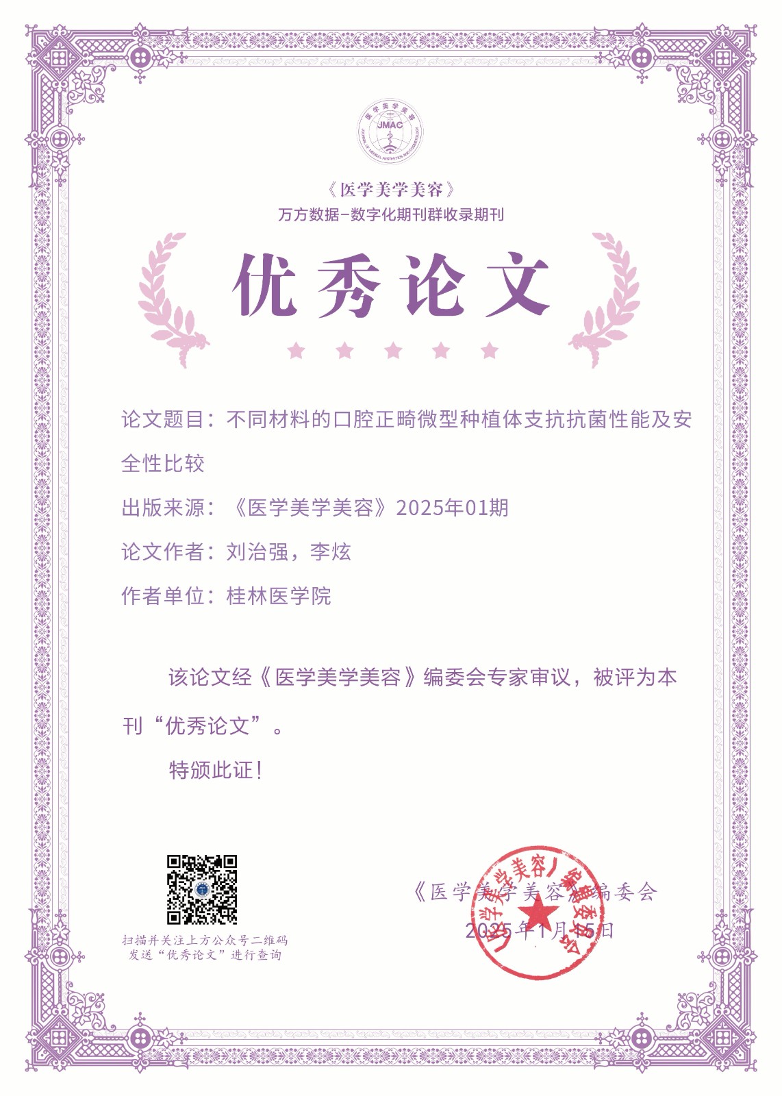 通过公示后,被评选为《医学美学美容》年度优秀论文者,可以获得由本刊编辑委员会颁发的《优秀论文证书》,示例如下: